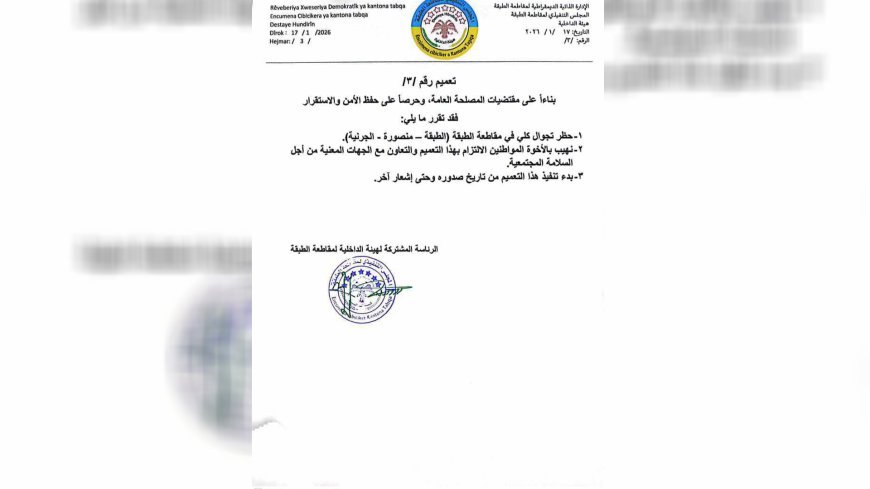 İçişleri Komitesi bugün, kamu güvenliğini korumak ve toplumsal istikrarı sağlamak amacıyla Tabka Kantonu’nda, Tabka, Mansura ve Carniye şehirlerini kapsayan tam sokağa çıkma yasağı ilan etti. Komite t...