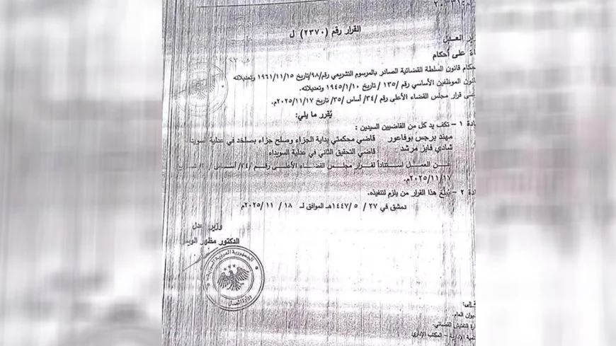 Karar kapsamında, Salkhad’da Asliye Ceza ve Sulh Ceza Mahkemelerinde görev yapan hâkim Muhannad Burjas Ebu Faour ile Süveyde Adliyesi’nde ikinci soruşturma hâkimi olarak görev yapan Şadi Fayez Mürşid görevden alındı.